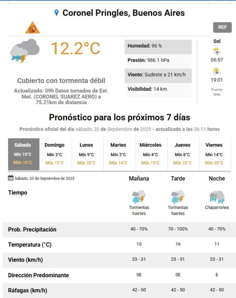 El Servicio Meteorológico Nacional actualizó este sábado las advertencias que rigen en Pringles y alrededores.