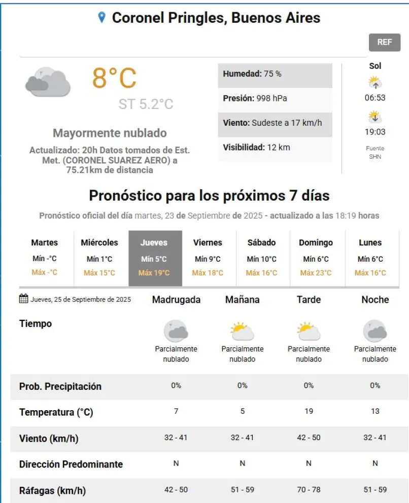 El Servicio Meteorológico Nacional ratificó el alerta amarilla por vientos para la tarde del jueves en Pringles y todo el Sudoeste Bonaerense.
