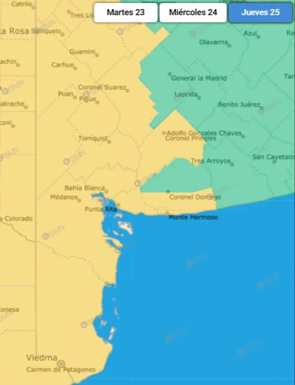 El área comprendida por la advertencia está integrada por los municipios de Patagones, Villarino, Puan, Adolfo Alsina, Guaminí, Coronel Suárez, Saavedra, Coronel Pringles, Tornquist, Bahía Blanca, Coronel Rosales, Monte Hermoso y el sur de Coronel Dorrego. También se verá afectada toda la provincia de La Pampa y el este y centro de Río Negro.