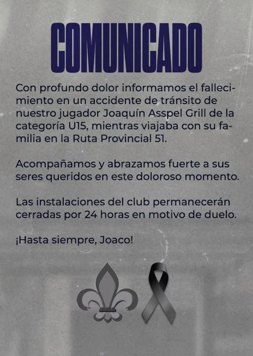 El club Bahiense del Norte decidió cerrar 24 horas por duelo sus instalaciones, a raíz del fallecimiento de Joaquín Asspel Grill, jugador de la categoría U15.