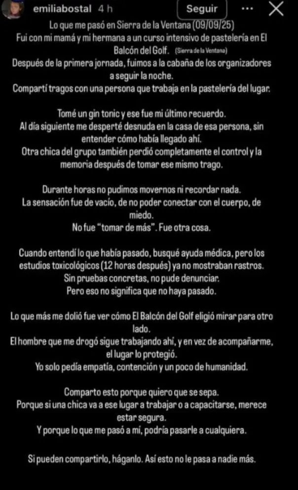 Emilia Bostal, de Bahía Blanca, denunció en redes sociales que fue dro gada y abu sada por un empleado tras participar en un evento de pastelería en Sierra de la Ventana. El complejo Balcón del Golf negó los hechos y difundió un comunicado despegándose de lo ocurrido.