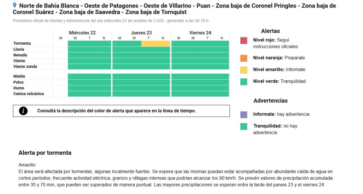 Tras una jornada de miércoles sin fenómenos climáticos adversos pronosticados, Pringles volverá a estar bajo la atención del mal tiempo. El Servicio Meteorológico Nacional (SMN) emitió una alerta amarilla por tormentas para este jueves, con posibilidad de eventos localmente fuertes que podrían generar nuevas complicaciones en la ciudad.