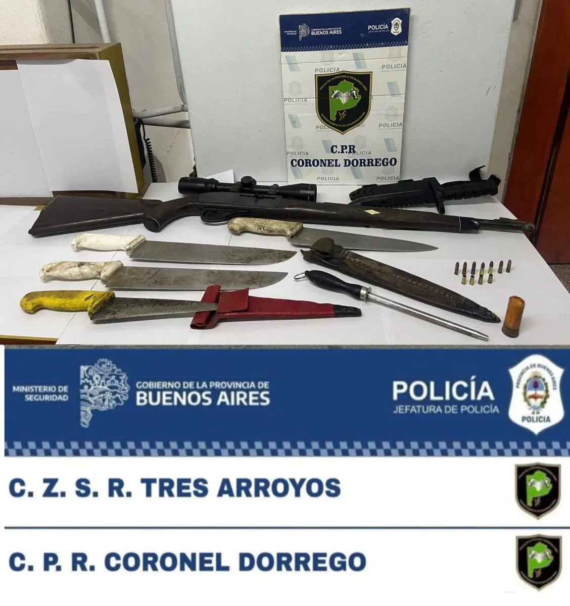 Cuatro vecinos de Indio Rico fueron demorados durante un operativo de control rural en jurisdicción de Coronel Dorrego. En el vehículo donde circulaban se halló un rifle calibre .22 sin documentación, junto con proyectiles y vainas servidas.