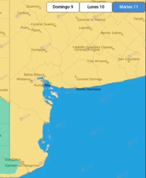 La advertencia rige para la mañana del martes, y comprende los distritos de Patagones, Villarino, Puan, Adolfo Alsina, Guaminí, Coronel Suárez, Saavedra, Coronel Pringles, Tornquist, Bahía Blanca, Coronel Rosales, Monte Hermoso y Coronel Dorrego. También incluye a gran parte de la provincia de La Pampa y la costa de Río Negro.