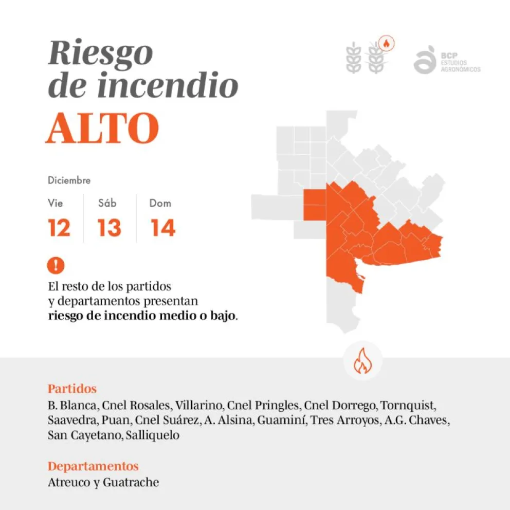 De acuerdo a un informe de la Bolsa de Cereales y Productos de Bahía Blanca (BCPBB), en el sudoeste de la provincia rige un alerta de alto riesgo de incendios rurales todo el fin de semana. Las condiciones climáticas, con altas temperaturas y la estación de cosecha en curso, han elevado significativamente el peligro en una amplia zona productiva, informó sudoesteba.com.