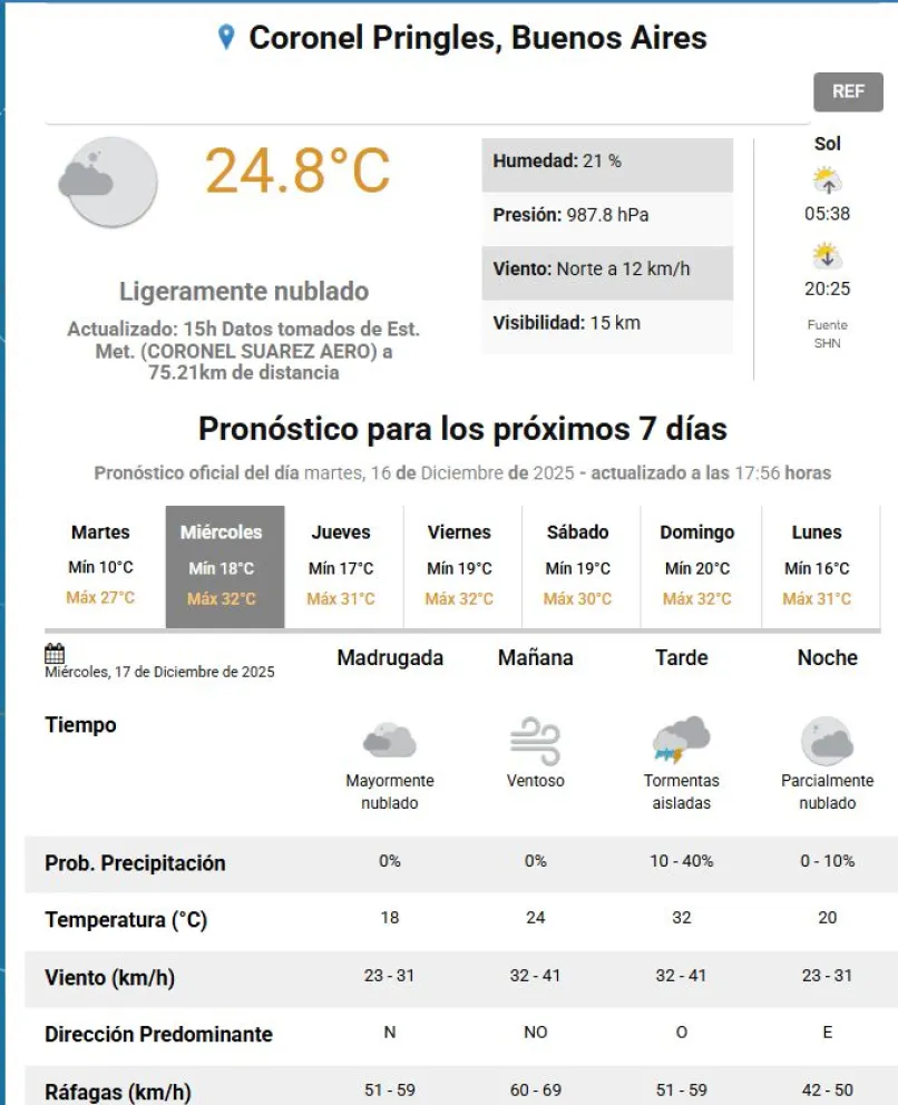 El aviso contempla los distritos de Coronel Pringles, Villarino, Puan, Bahía Blanca, sur de Coronel Dorrego, Monte Hermoso, Saavedra, Coronel Rosales, Tornquist y Coronel Suárez, además del oeste de Patagones.