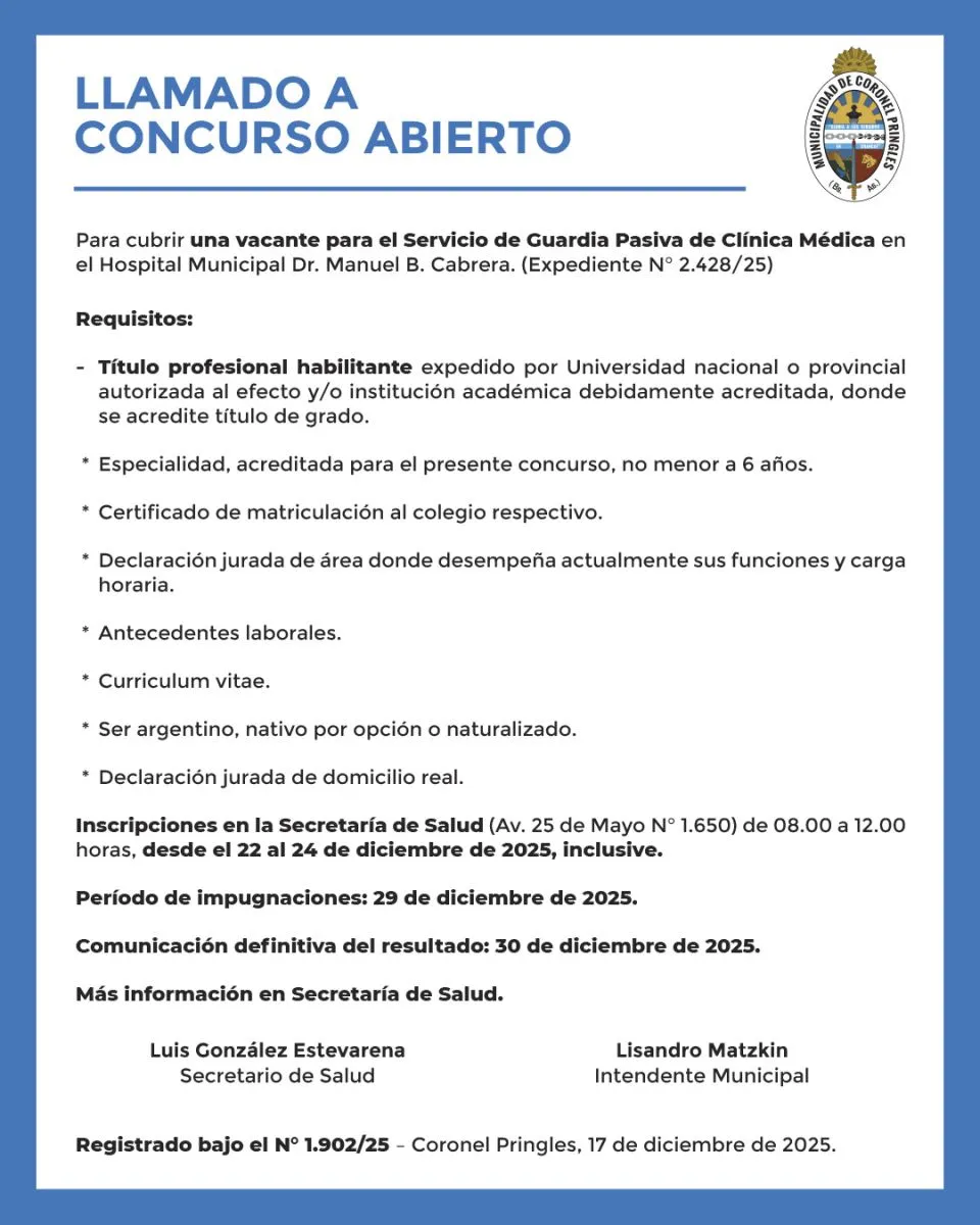 Para cubrir una vacante para el Servicio de Guardia Pasiva de Clínica Médica en el Hospital Municipal Dr. Manuel B. Cabrera. (Expediente N° 2.428/25)