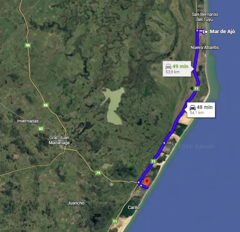 Las obras de ampliación y mejoras se dan en la Ruta Provincial 11 entre Mar de Ajó y Pinamar. Foto: Agencia NA (Captura Google Maps).