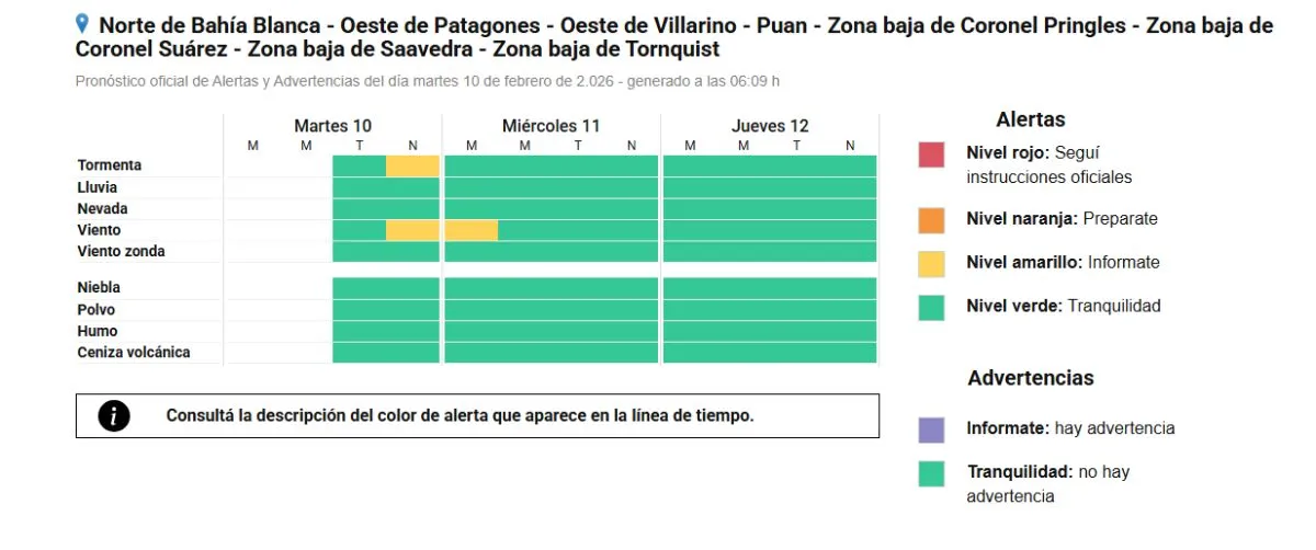 Según se indicó desde el ente, ambos alertas comprende los distritos de Patagones, Villarino, Puan, Adolfo Alsina, Coronel Suárez, Saavedra, Coronel Pringles, Tornquist, Coronel Rosales, Bahía Blanca, Monte Hermoso y el sur de Coronel Dorrego. También incluye a gran parte de Río Negro y La Pampa.