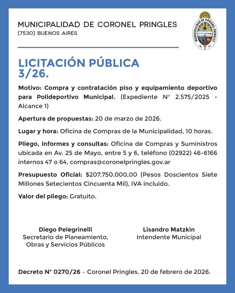 Decreto Nº 0270/26 – Coronel Pringles, 20 de febrero de 2026.