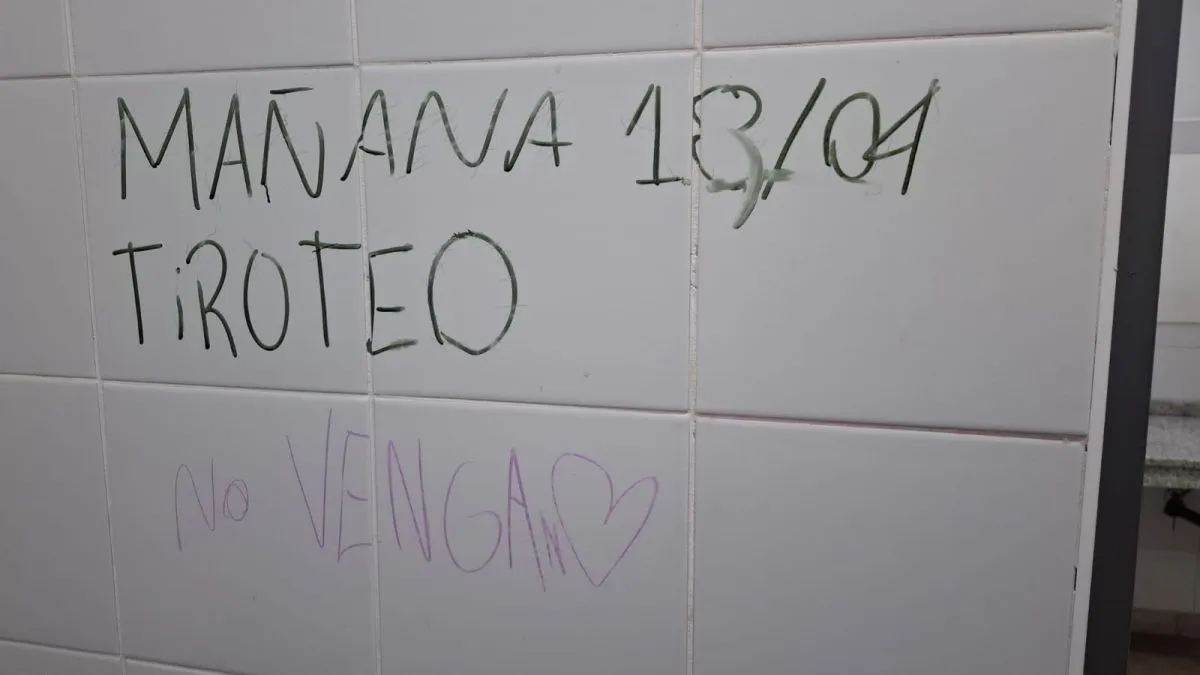 Según el informe, las directoras de la E.E.S. N° 1 (ex Colegio Nacional), la E.E.S.T. N° 1 (Escuela Técnica) y la E.P.P. N° 1 (Escuela 40) denunciaron el hallazgo de inscripciones en los baños con mensajes como "Lunes tiroteo 20/4" y "Mañana 18/4 tiroteo no vengan".